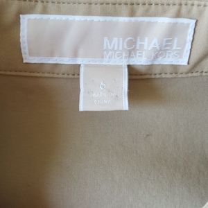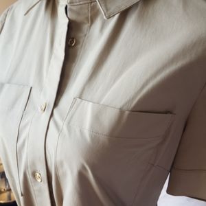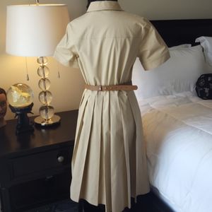 Great condition; 2 breast pockets; 5 gold buttons; pleated skirt; belt loop on each side; can be worn with or without a belt (belt shown is unavailable); side zipper; 39" long; 18.5" from armpit to armpit; 16" from one side of waist to other (when laid flat). 97% cotton, 3% elastane.