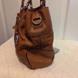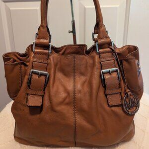 Michael Kors Shoulder Bag, is in pretty good condition. It does have a couple of dark spots on the bag, it also has a little pink spot as well. I have tried to show those in the pictures. It has three separate compartments with a magnetic closure.