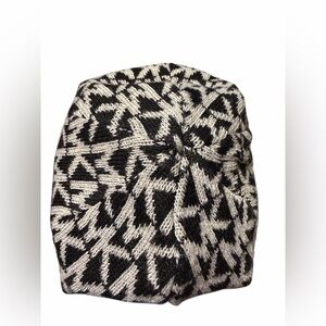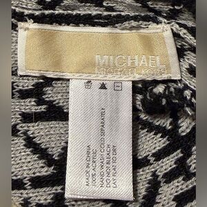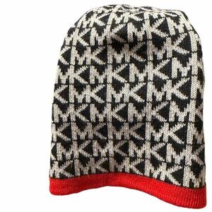Michael Kors Stylish signature beanie featuring a black and gray signature pattern with a bold red trim. Perfect for adding a touch of flair to your outfit.