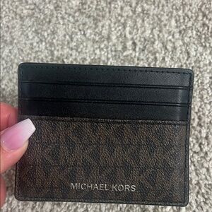 Stylish card holder with signature design. Features black and brown tones. Ideal for everyday use.