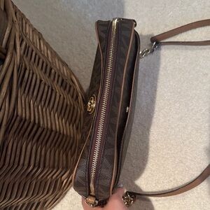 Elegant Michael Kors crossbody with signature MK pattern. Features gold-tone chain accents and adjustable strap. Perfect for everyday style.