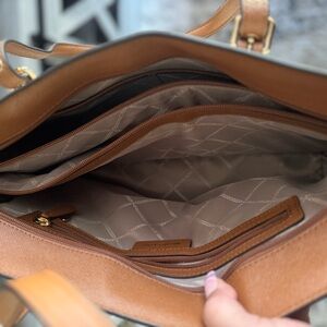 Elegant Michael Kors tote with signature MK pattern. Features rich brown accents and durable straps. Ideal for daily use.