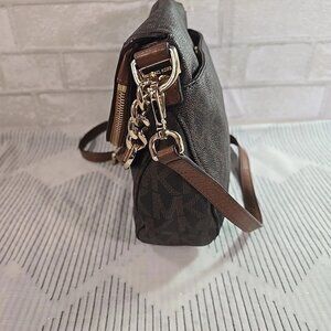 Michael Kors Signature Fold over Brown Leather Shoulder Bag Handbag w/ Tassell