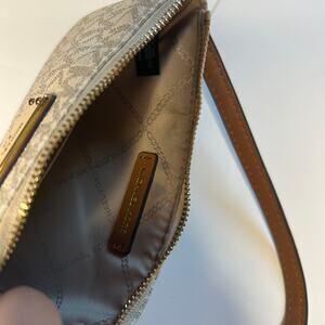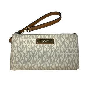 Showcasing a sleek, versatile silhouette, this zip wristlet by MICHAEL Michael Kors features a signature print for instant sophistication. MK Signature coated twill PVC; lining: polyester 7-1/4"W x 4"H x 1/2"D 7"L adjustable removable wristlet strap Top-zip closure 18k gold-tone exterior hardware & logo plate 1 interior credit card slot Fits all iPhones. VGUC. Smoke free and pet friendly (non-shedding) home.