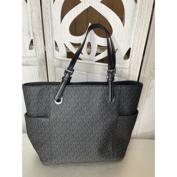 Michael Kors Signature Large Jet Set Logo Tote Black With Silver Hardware