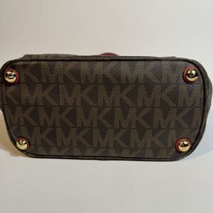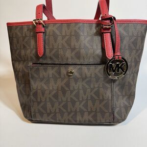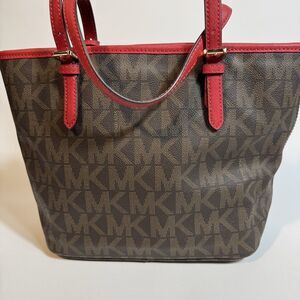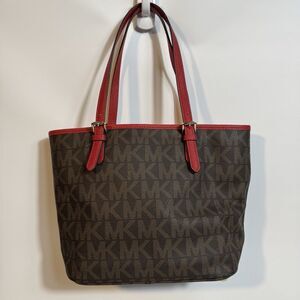 Michael Kors Signature Leather Jet Set Tote Bag Dark Brown Red PVC Leather
