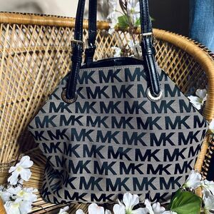 Stylish and versatile, this Michael Kors Jet Set handbag features the iconic MK signature logo in tan and black canvas, accented with elegant gold-tone hardware. The spacious interior and multiple compartments make it perfect for organizing your essentials, while the durable material ensures everyday luxury.