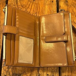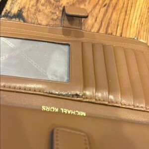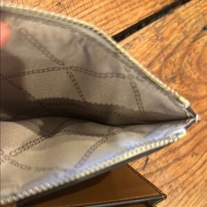 Classic beige Michael Kors wristlet with all-over MK logo and tan leather wrist strap. Compact and chic—perfect for carrying essentials.