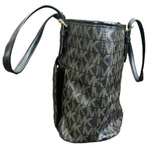Black tote with tan monogram, gold hardware, double straps, three interior compartments, one with zipper closure, one small zipper pocket,, four interior multifunction slots, interior strap for keys, and exterior pocket with snap closure.