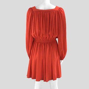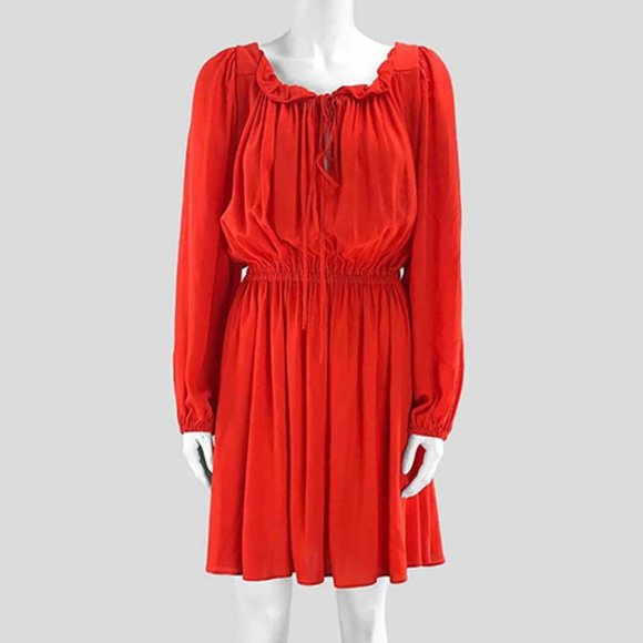 Michael Kors Collection bright orange ruffle-trimmed neckline dress in 100% silk with gathered, elasticated waist. Long sleeves with elasticated cuffs. Slip on dress.
