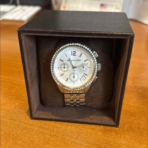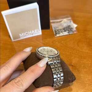 This elegant Michael Kors watch showcases a refined silver-tone finish, highlighted by a classic chronograph design. The watch features a distinctive textured bezel and a coordinating metal link bracelet, offering a timeless accessory for any occasion.