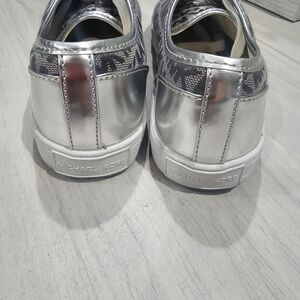 Stylish Michael Kors sneakers in gray with silver accents. Features a bold MK logo design.