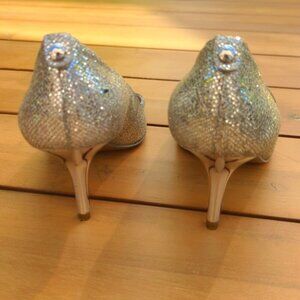 Elevate your style with these stunning Michael Kors silver heels, featuring a glamorous glitter finish and elegant peep-toe design. Perfect for formal occasions, these shoes offer a sophisticated touch to any look.