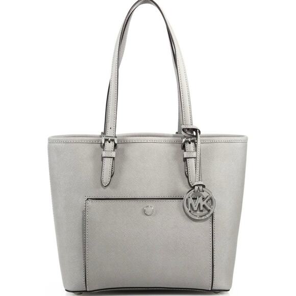 A chic and stylish tote bag by Michael Kors, perfect for everyday use. This versatile handbag features a sleek silver metallic finish, a convenient front pocket with a snap closure, and signature MK logo charm. The interior is lined with a monogrammed fabric and includes multiple pockets for organization. This Michael Kors tote combines fashion and function effortlessly, making it an ideal accessory for any outfit.