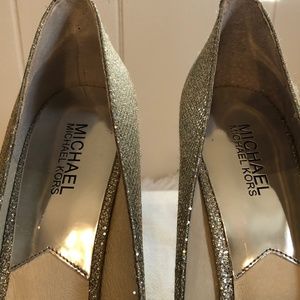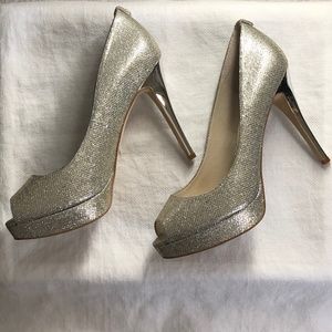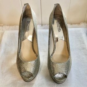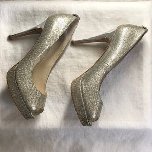 Michael, Michael Kors York Silver Sparkly Peep Toe Platform Heels