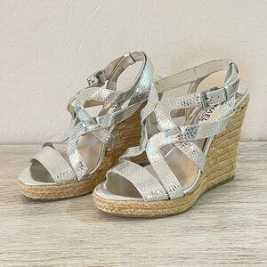 Michael Kors Silver Platform Wedge Sandals 5.5 Espadrilles Jute Heels Palm Beach