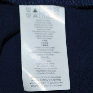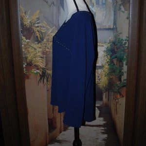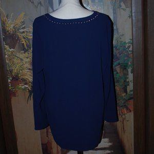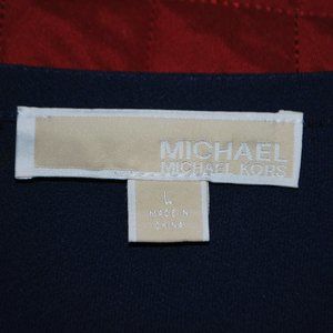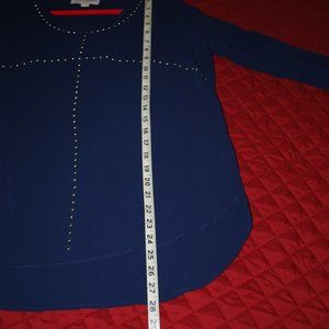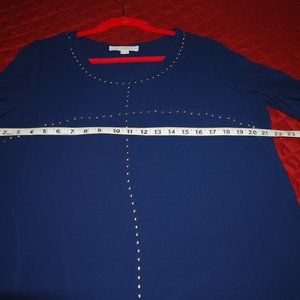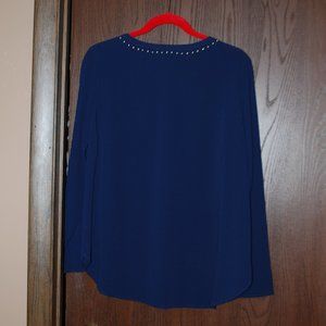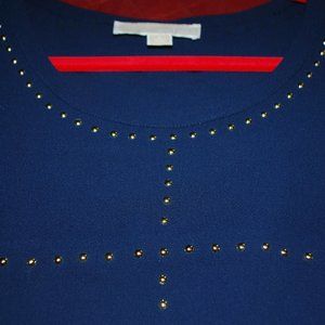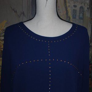 This navy top is lightweight so perfect under a jacket or all by itself. Silver studs surround the neckline and criss-cross on the bodice. Rounded high-low hemline. Machine washable. By Michael Kors, size L. EUC