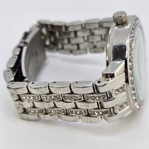 Elegant silver watch with crystal accents. Features a patterned dial. Perfect for any occasion.