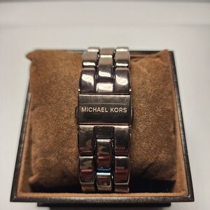 Stylish Michael Kors watch with a brown metal band and brown face. Elegant design with gold accents. Minor scratches on back as shown. (Brown watch box not included)