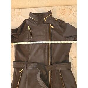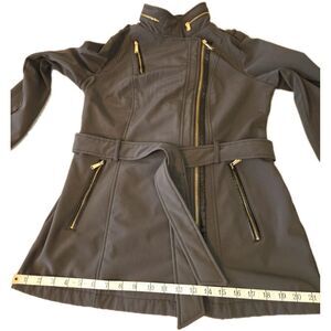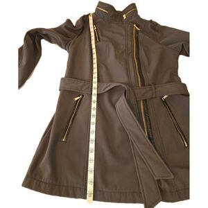 The Michael Kors Size S Grey/Green Asymmetrical Zip Belted Coat Jacket with Faux Fur Lining is a stylish and versatile outerwear piece suitable for travel, casual, and business occasions. Made from a polyester blend with a softshell fabric type, this mid-length overcoat features a unique asymmetric zipper design and gold accents for added flair. The jacket is designed for the modern woman, with long sleeves, zipped pockets, and a belted waist for a flattering silhouette. Perfect for the winter, fall, and spring seasons, this designer jacket from Michael Kors combines luxury with practicality for the fashion-forward individual.