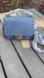 Chic Michael Kors clutch with embossed slate blue texture. Gold clasp with logo detail.