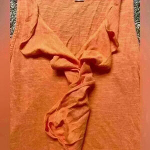 Orange sleeveless blouse with ruffle design on front. One very small hole next to the tag