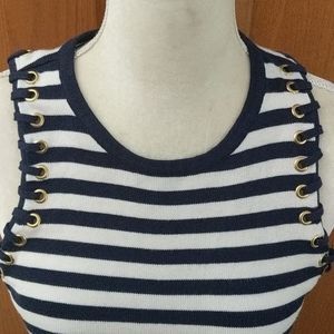 Michael Michael Kors Sleeveless Striped Sweater Dress, Grommet detail, Sleeveless,Michael Kors gold hardware on back, Approximate measurements Chest 32" Length 38", Cotton Viscose Nylon. Questions please ask.