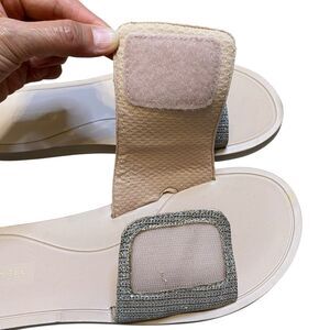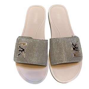 Michael Kors Slide Sandals Women 10M Silver Logo MK Glam Beach Resort Casual. Condition: they look like never worn, like new shoes, without box.