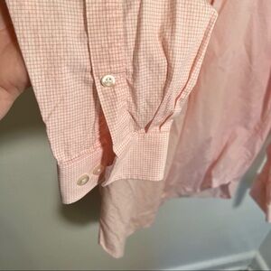 Great condition. Michael Kors. dress shirt. Slim fit. Long sleeve. White with orange checkered pattern. Textured. Size Large 16 34/35. 100% cotton. Pit to pit laying flat 21” Shoulder to hem 29” Sleeve (pit to hem) 21”. All measurements are approximate and taken lying flat. Smoke free home. No trades, offers welcome.