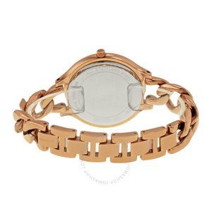 Rose gold-tone stainless steel case with a rose gold-tone stainless steel twist bracelet. Fixed rose gold-tone bezel. Rose dial with rose gold-tone hands and index hour markers. Dial Type: Analog. Quartz movement. Scratch resistant mineral crystal. Pull / push crown. Solid case back. Case diameter: 42 mm. Case thickness: 8 mm. Round case shape. Band width: 11 mm.