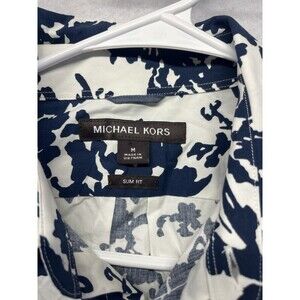 The Michael Kors Slim-Fit Stretch Floral Print Button-Up Shirt for men in size M is a stylish and versatile addition to any casual wardrobe. Made from a blend of nylon, cotton, and elastane, this shirt features a leaf sketch print pattern in a deep midnight blue color. With a collared neckline, long sleeves, and button closure, this shirt is perfect for everyday wear. The slim fit and stretch features ensure comfort and a modern look, making it a great choice for men who appreciate quality and style.