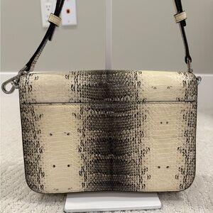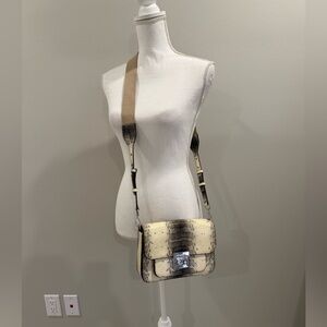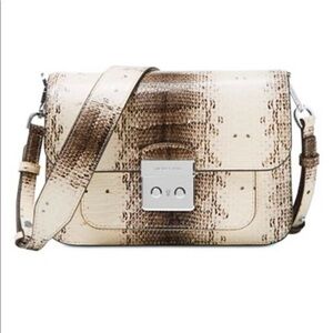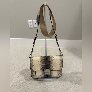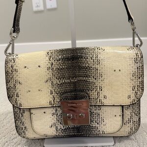 Michael Kors Sloan Editor crossbody bag. Snake embossed patterned leather. Beautiful cream and brown colors. Silver tone hardware. Push lock closure. Back pocket on the bag for which phone access. Inside the bag, there are 3 compartments. Largest compartment has a slip pocket and a zippered pocket. Other compartments are open. Adjustable strap is fully removable to allow you to carry the bag as a clutch.