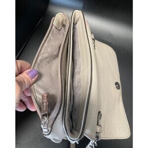 Michael Kors Small Light Grey Fulton Flap Closure Chain/Leather Strap. This bag is in very good preowned condition. There are a few ink pen marks under the flap closure so are not visible when closed. This bag has 3 interior sections, an outside snap pocket, removable chain/leather strap and Michael Kors Signage on front. There is one zippered inside compartment and 2 open with one having a divider pocket for credit cards. Please study all photos carefully to confirm condition.
