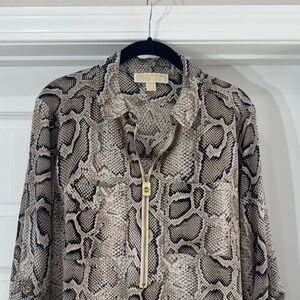 Stylish snake print blouse featuring a front zipper. Perfect for a chic look. Worn and washed twice. Smoke free and pet free home. Bundle and save!!