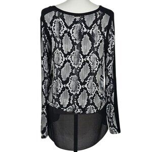 Boatneck knit long sleeve top in black, gray, and white snake print. Bottom hem made of chiffon in black is longer in back than front. Stretchy and comfortable!