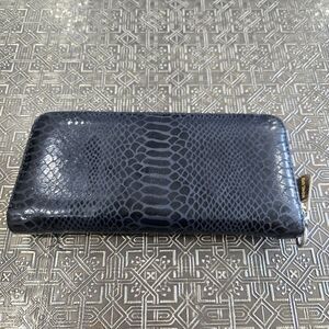 Stylish black snake print wallet with a sleek design. Features a metallic logo plate on the front.