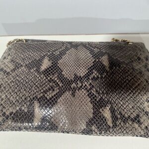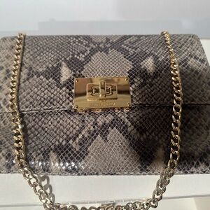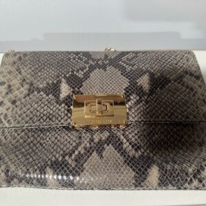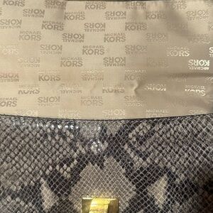 Elevate your style with this chic Michael Kors snake print crossbody bag. Featuring a sophisticated black and gray design, this bag is perfect for any occasion. The gold-tone hardware adds a touch of luxury.