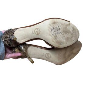 Michael Kors Snakeskin & Leather Tan Peep Toe Stiletto Ankle Strap These Michael Kors heels combine sophistication and modern flair with their snakeskin ankle strap and tan leather design. The peep toe and stiletto heel add elegance, making them suitable for various settings. The secure ankle strap ensures comfort and style with every step. • Snakeskin Print Ankle Strap • Tan Leather Upper • Peep Toe Design • Gold-Tone Hardware • Zipper Closure • Stiletto Heel Heel height approximately 3 inches. Good used condition No damage or defects