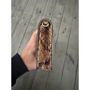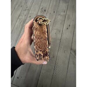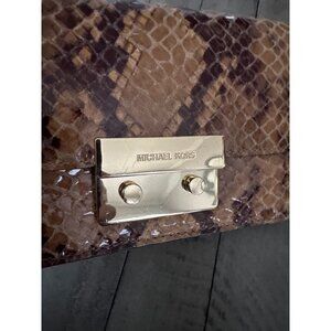 Excellent condition- Michael Kors - Crossbody - Reptile style Leather crossbody pocketbook with variations of Dark Brown, Brown & Tan colors with Gold-tone chain strap & front clasp. Strap can be removed & it can be used as a clutch handbag.