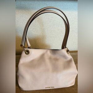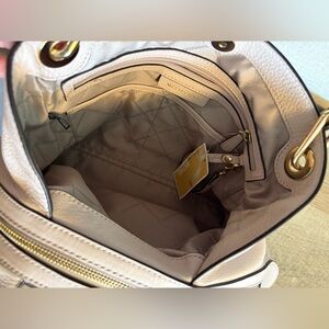 This Michael Kors shoulder bag in a sophisticated cream hue is crafted from soft leather, offering a slouchy yet elegant silhouette. The gold-tone hardware adds a touch of luxury, making it a timeless accessory for any occasion.