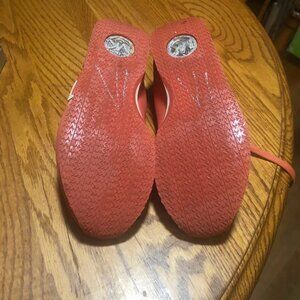 Salmon pink shoes with white back and some silver embellishments on bottom, insoles, and on back
