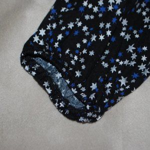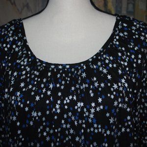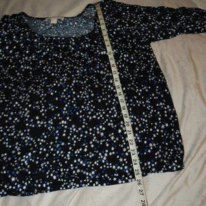 This top features blue and white stars on a black background. Rounded neckline, light gathering down the front and it's lightly elastic at the bottom hem and sleeves. Very soft and comfy. It is missing the washing instructions, but I bought this and an almost identical one at the same time so assuming washing is the same: Machine wash cold and lay flat to dry. The other one is also listed here and still has the tags on it. Only worn once. By Michael Kors, size L.