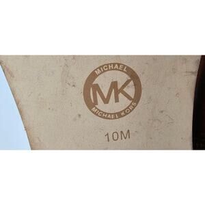 Features: Gold tone hardware; Metal logo and buckle; Stacked block heels; Zipper closure