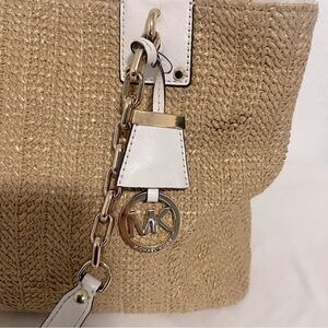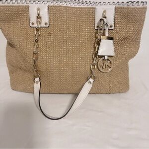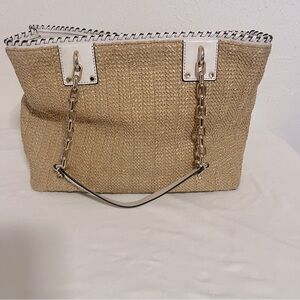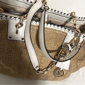 Michael Kors Straw Rosalie Tote Handbag with White Leather Straps and Gold EUC
