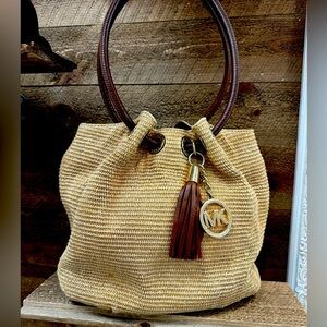 Michael Kors Straw Tote with Leather Handles & Tassel Charm