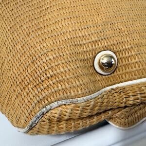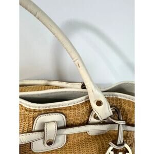 Stylish Michael Kors shoulder bag featuring woven straw panels with white leather accents. Gold and stud details add elegance. Includes multiple pockets and magnetic button closure for convenience.