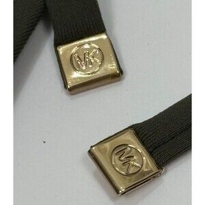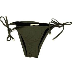 Chic and timeless Michael Kors 2-piece string bikini in a dark green hue with luxe gold-tone branded hardware. Triangle top with studded accents ties at the neck and back with branded end caps. Side-tie bikini bottoms feature matching gold MK logo end caps. Designer swimwear with quality stretch fabric and fully lined for a flattering fit. Top has lining padding pouch without pads. Michael Kors brand tags on both pieces, size/material tags removed. Perfect for resort wear, pool parties, beach vacations, and sun-drenched getaways. Elevate your swim style with this iconic MK set thats equal parts glam and effortless.
