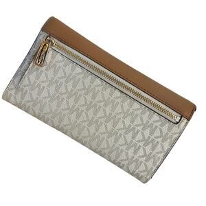 Michael Kors, MK wallet, designer wallet, studded wallet, brown wallet, leather wallet, logo print, signature MK, snap closure, zipper pocket, card holder, slim wallet, chic wallet, everyday wallet, gold hardware, neutral wallet, women’s wallet, compact wallet, gift for her, modern style