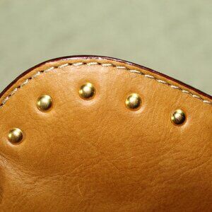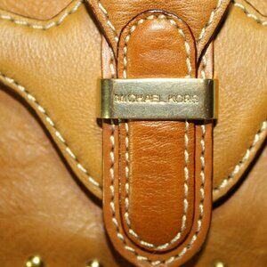 Elevate your accessory game with the Michael Kors Studded Clutch, a small yet sophisticated piece that merges style with functionality. Crafted from premium leather, this clutch features a chic tan exterior accented with elegant gold hardware and a plush cream fabric lining. Its compact design, measuring 9 inches in width, 5 inches in height, and a depth of 1 inch, makes it a perfect companion for your essentials without the bulk. The clutch boasts a solid pattern with a subtle studded accent that adds a touch of glamour to the overall aesthetic. A magnetic closure ensures that your belongings stay secure while allowing easy access. Complemented with a tan leather handle/strap, this clutch is an ideal choice for those who appreciate a balance of simplicity and flair in their everyday elegance.