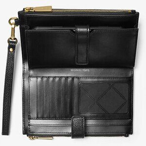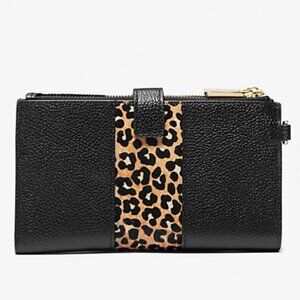 Stylish wristlet with leopard-print calf hair stripe and studded gold hardware. Sleek with an array of interior features, this wristlet can be tossed in your favorite handbag to use as a wallet or strap it around your wrist as a wristlet.